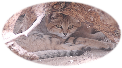 Sand cats are appropriately coloured against the backdrop of arid desert – they are a light yellow colour, and have a white belly. From the eye’s side opposite its nasal bridge there is a dark red stripe which stretches down its cheeks. The area below the eye, and this red stripe, is largely white in colouration. The back of the sand cat’s ears, like many other cats, have a black tip. There are a few other dark stripes which encircle the animal’s legs – usually two, thick stripes. There are also dark stripes on the main portion of the body, with both stripes and streaked-spots on the hind legs – though the prominence of these is dependent on the animal – some sand cats have these very prominent, and in others they are hardly noticeable. There are a few stripes also on the animal’s tail - which is about half of the body length, with a black tip. The sand cat has thick fur which covers the soles of its paws – as to prevent the paws from overheating, and also giving assistance to moving over the loose sand. Like any other resident of the desert, Sand cats must not only be adapted for the heat of the day; but also the extreme cold of the night. They have thick fur – which reduces the loss of body temperature, so that heat is preserved. They have an overal body length of about 45 centimetres, a tail of 25 or so centimetres, a height of 25 centimetres at shoulder, and a weight of about 2 kilogrammes.